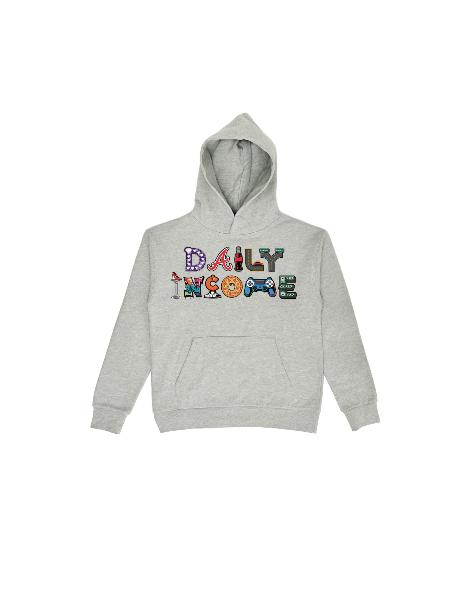 Oversized, heavyweight hoodie featuring the colorful Daily Income mixed-icon graphic — each letter built from pieces of everyday hustle: money, gaming, nightlife, sneakers, food, and more. Premium soft-feel DTF print on a thick, cozy fleece hoodie built for daily wear.